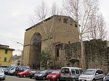 Through this gate, King Charles VIII of France entered Florence.[2] A depiction of the gate circa 1494 can be seen in a painting by Filippino Lippi: a Madonna and Child with St John among Sts Martin of Tours and Catherine of Alexandria found in the Nerli Chapel of the church of Santo Spirito, Florence.[3] The gate still has its large wood and metal doors.