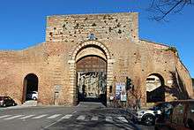 Formerly known as the Porta delle Maremme, this two story gate was first built around 1325-1326, about the time the Porta Tufi was built. It was refurbished in the 16th century by Baldassarre Peruzzi. The gatehouses and antiporti were demolished in the 19th century. The former Oratory of San Marco found near the gate is also no longer present. Above the external archway is a round christogram of St Bernardino of Siena.
