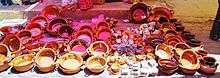 Metepec is one of a number of ceramic centers in Mexico, along with Oaxaca, Puebla, various parts of Michoacán and the Guadalajara area although it produces a significantly smaller quantity.[1] While other handcrafts are made in the municipality, pottery is the most important.[2] The creation of pottery in Metepec is traditional, family-oriented and of a distinctive local design and manufacture. It maintains many of its traditional techniques from the colonial period, passed down in pottery making families usually done by men but women are also involved. In many areas such as the neighborhood of Cuaxustenco, family homes double as workshops able to handle all phases of creation including firing. The pottery can be distinguished by both the clays it uses as well as its shapes and decorative styles, which unique to the area although not absolutely purist.[3] The clay used in Metepec pottery is extracted from neighboring areas such as Octotitlán, San Felipe Tlamimilolpan and Tlacotepec. This originally was down with cart and donkey but today is done with motorized vehicles.[4] There are three main clays, red, a sandy yellow and black.[4][5] The most traditional shaping method is coiling over a tortilla-like base.[4]