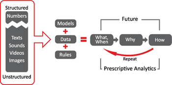 Prescriptive analytics not only anticipates what will happen and when it will happen, but also why it will happen. Further, prescriptive analytics suggests decision options on how to take advantage of a future opportunity or mitigate a future risk and shows the implication of each decision option. Prescriptive analytics can continually take in new data to re-predict and re-prescribe, thus automatically improving prediction accuracy and prescribing better decision options. Prescriptive analytics ingests hybrid data, a combination of structured (numbers, categories) and unstructured data (videos, images, sounds, texts), and business rules to predict what lies ahead and to prescribe how to take advantage of this predicted future without compromising other priorities.[8]