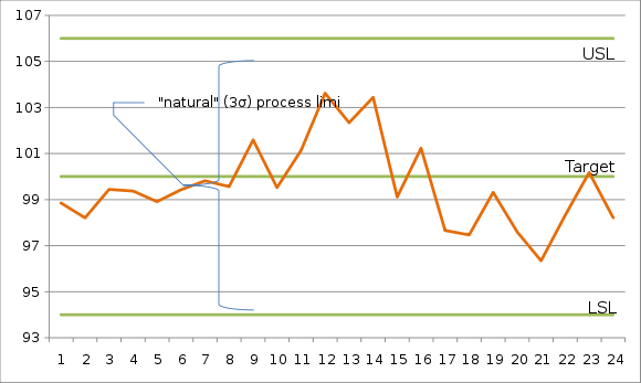 Consider a quality characteristic with a target of 100.00 μm and upper and lower specification limits of 106.00 μm and 94.00 μm, respectively. If, after carefully monitoring the process for a while, it appears that the process is out of control and producing output unpredictably (as depicted in the run chart below), one can't meaningfully estimate its mean and standard deviation. In the example below, the process mean appears to drift upward, settle for a while, and then drift downward.