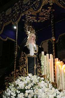However, this particular procession was officially established in 1954.[3][10] At this time, bullfighters Fermín Rivera, Carmelite priest Nicolás de San José and others began a small event to enact the Stations of the Cross and pay homage to Our Lady of Solitude by the guild of bullfighters at the El Carmen church.[6][8][9] It is based on the annual procession in Seville, Spain in honor of Our Lady of Macarena, although this version is dedicated to Our Lady of Solitude, because of the devotion of the bullfighters to this image of the Virgin Mary.[6]