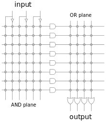 A programmable logic array (PLA) is a kind of programmable logic device used to implement combinational logic circuits. The PLA has a set of programmable AND gate planes, which link to a set of programmable OR gate planes, which can then be conditionally complemented to produce an output. It has 2^N AND Gates for N input variables and for M outputs from PLA, there should be M OR Gates, each with programmable inputs from all of the AND gates. This layout allows for a large number of logic functions to be synthesized in the sum of products (and sometimes product of sums) canonical forms.