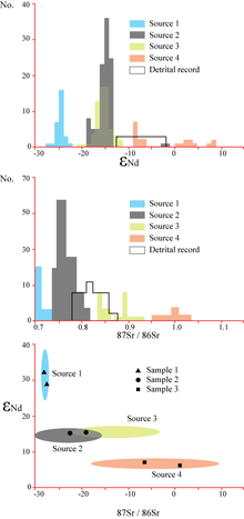 Provenance (from the French provenir, "to come from"), is the place of origin or earliest known history of something...[1] In geology (specifically, in sedimentary petrology), the term provenance deals with the question where sediments originate from. The purpose of sedimentary provenance studies is to reconstruct and to interpret the history of sediment from parent rocks at a source area to detritus at a burial place.[2] The ultimate goal of provenance studies is to investigate the characteristics of a source area by analyzing the composition and texture of sediments.[3] The studies of provenance involve the following aspects: "(1) the source(s) of the particles that make up the rocks, (2) the erosion and transport mechanisms that moved the particles from source areas to depositional sites, (3) the depositional setting and depositional processes responsible for sedimentation of the particles (the depositional environment), and (4) the physical and chemical conditions of the burial environment and diagenetic changes that occur in siliciclastic sediment during burial and uplift".[4] Provenance studies are conducted to investigate many scientific questions, for example, the growth history of continental crust,[5][6] collision time of Indian and Asian plates,[7] Asian monsoon intensity, and Himalayan exhumation[8] Meanwhile, the provenance methods are widely used in the oil and gas industry. "Relations between provenance and basin are important for hydrocarbon exploration because sand frameworks of contrasting detrital compositions respond differently to diagenesis, and thus display different trends of porosity reduction with depth of burial."[9]