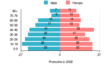 (by sex in 2002)TOTAL Males Females I. TOTAL person 315 160 155 — of which in % 100 50.8 49.2 1. BY AGE GROUP A. At pre-working age person 81 41 40 — of which in % 25.7 13 12.7 B. At working age. grand total person 174 97 77 — of which in % 55.2 30.8 24.4 a. at mobile working age person 114 64 50 — of which in % 36.2 20.3 15.9 b. at non-mobile working age person 60 33 27 — of which in % 19 10.4 8.6 C. At post-working age person 60 22 38 — of which in % 19.0 7 12