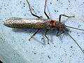 P. californica nymphs, or larvae, can grow to lengths in excess of 5 centimetres (2 in). The nymphs' dorsal side (back) is dark in color, although their ventral side (belly) is lighter. The coloring can vary, and subtle patterns are occasionally found on the abdomen. They are detritivores, eating stream debris partially broken down by other organisms. They are "shredders" as a functional feeding group, breaking down large bits of detritus into smaller while feeding.[2] The adults are also large, and the abdomen, leg joints, and several thorax joints are a bright orange color. Two pairs of large wings, kept flat against the body when at rest, are nearly as long as the body.