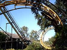 Python's double-corkscrew element (chain lift and first drop in background). | |