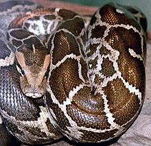 The Pythonidae, commonly known simply as pythons, from the Greek word python (πυθων), are a family of nonvenomous snakes found in Africa, Asia, and Australia. Among its members are some of the largest snakes in the world. Eight genera and 31 species are currently recognized.[2]