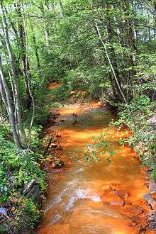 Quaker Run has a thick layering of iron precipitate along its length. The layering is more thick and solidly packed than in some other nearby streams.[3] Historically, there was a quarry near the stream.[10] Mine complexes also extend under the stream.[4]