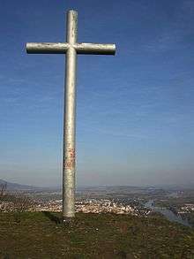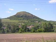 Radobýl (399 m) is a basalt hill in České středohoří mountains, Czech Republic. It rises above village of Žalhostice on right bank of the Elbe River 3 km west of Litoměřice. Part of the hill with abandoned basalt quarry and rich rock steppe flora is under protection as Radobýl Nature Monument (Přírodní památka Radobýl). The hill is a popular hiking destination. From huge metallic cross (erected in 1992) on the bare summit there is almost 360-degrees panoramic view of central part of České středohoří Mts., Litoměřice, Terezín and Lovosice.