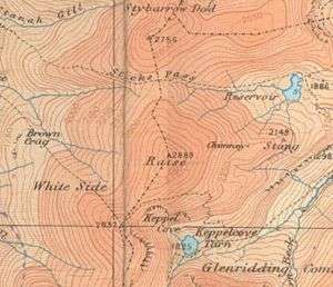 South of Raise the ridge swings a little to the west, crossing an unnamed col on the way to White Side. The eastern face of this ridge is gouged deeply by Kepple Cove, a corrie whose back wall is named Red Screes. Kepple Cove once contained an artificial tarn, although today the bed is merely marshy except after heavy rain. The water from the tarn was used in a hydroelectric scheme to drive electric winding gear at Greenside Mine. Commissioned in 1891, this was the first such system in the country.[3] It continued in use until the night of 29 October 1927 when the Kepple Cove dam burst during a heavy storm, leaving an 80 ft (24 m) wide gap in the earthworks. The resulting wave passed down the valley and through Glenridding village, flooding buildings and causing extensive damage. The breached dam can still be seen today.[3][4]