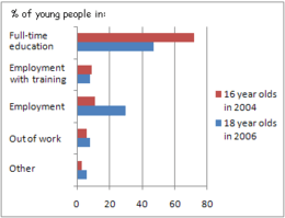Graph showing the percentage of young people in employment or training, at ages 16 and 18 respectively.[23]