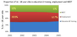 Reports published by the DfES showed that although there are around 70% of 16 year olds who remain in full-time education, this declines to less than 50% by the time they reach 18, with the majority finding unskilled employment and even fewer going into employment where their training has relevance. There is also a small increase in those who become unemployed by the time they reach 18, which the government hoped to reduce with the act.[23] It is these cases of unemployment which the government believes to be the toughest, whom it classifies as NEET (Not in Education, Employment or Training). In 2006 an additional 7% of 16 year olds fell into this category and the proportion rose to 13% among 18 year olds.[23] In practice, only 1% of young people are classified as NEET during their time aged 16–18, due to churn between training, employment and NEET classification.[31] In 2015 the percentage of 16-18 classified as NEET fell to 7.5%, the lowest figure since 2000.[32]