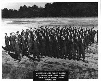 Ranger Training began in September 1950 at Fort Benning Georgia "with the formation and training of 17 Airborne Companies by the Ranger Training Command".[6] The first class graduated from Ranger training in November 1950, becoming the 1st Ranger Infantry Company.[7] The United States Army's Infantry School officially established the Ranger Department in December 1951. Under the Ranger Department, the first Ranger School Class was conducted in January–March 1952, with a graduation date of 1 March 1952. Its duration was 59 days.[8] At the time, Ranger training was voluntary.