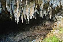 The cave's entrance is one of the largest cave entrances in New Zealand[4] with an opening of about 40 metres (130 ft) wide and up to 20 metres (66 ft) tall.[5] The ceiling is densely covered in stalactites which become increasingly finer deeper down into the cave. A short walking track leads halfway down into the cavernous opening to a viewing platform.