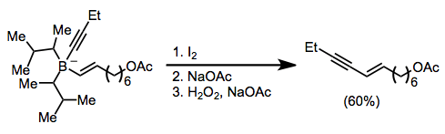 Treatment of an alkenylborane with iodine or bromine leads to migration of one of the organic groups attached to boron. Alkynyl groups migrate selectively, forming enynes after treatment with sodium acetate and hydrogen peroxide.[18]