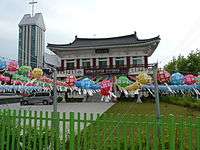 This measures, combined with the rapid social changes of the same period,[2] favoured a rapid revival of Korean Buddhism and growth of Christian churches in a trend to adhere to organised religions.[29] The number of Buddhist temples rose from 2.306 in 1962 to 11.561 in 1997, Protestant churches rose from 6.785 in 1962 to 58.046 in 1997, the Catholic Church had 313 churches in 1965 and 1.366 in 2005, Won Buddhism had 131 temples in 1969 and 418 in 1997.[30] Similarly, Daesun Jinrihoe's number of temples has grown from 700 in 1983 to 1.600 in 1994.[31] Statistics from censuses show that the proportion of the South Korean population self-identifying as Buddhist has grown from 2.6% in 1962 to 22.8% in 2005,[2] while the proportion of Christians has grown from 5% in 1962 to 29.2% in 2005.[2]