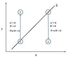 K-theory is best applied in statically neutral environments, with predominately mechanically-generated turbulence, though it has been applied to statically stable environments.[1] The figure to the right demonstrates how temperature flux works in a stable environment. If a parcel is displaced upward in a stable environment, w' is positive 0, and θ' is greater than the mean θ. So w'θ' is greater than zero. Conversely, when a parcel is displaced downward, w' is negative, and θ' is negative.