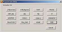 The RoboLogix instruction set contains 16 commands, which are usually written as a program on a line-by-line basis. These commands are used to instruct the robot to perform tasks such as moving to a specific location, picking up an object, executing a subroutine, waiting, etc. One of the more popular commands in the instruction set is the IF instruction, which compares numerical values located in two registers. If a register has a value that is greater than (>), less than (<), greater than/equal to (>=), less than/equal to (<=), equal to (=), or not equal to (<>) another register, it will execute the next line in the program if the condition is true. The IF command is often used with the JMP LBL instruction to control program execution.