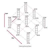 Palletizing is one of the more popular applications for robots,and is accomplished by combining a series of commands into a palletizing routine. A RoboLogix palletizing routine consists of five program instructions, or lines. The first instruction is the Palletize instruction, which is followed by a linear motion instruction to move to the stack point. The stack point is the top-center of the workpiece, and a group of stack points forms a stacking pattern, as shown in the adjacent image. The first stack point in a stacking pattern is located at (1,1,1) (row,column, layer) and is incremented each time the palletizing routine is executed.