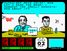 The player's first task as manager is to pick musicians for the band (see below), and then whether they should buy them brand new equipment, second hand equipment or get some dodgy gear off the back of a lorry.