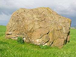 Rocking stones (also known as logan stones or logans) are large stones that are so finely balanced that the application of just a small force causes them to rock. Typically, rocking stones are residual corestones formed initially by spheroidal weathering and have later been exposed by erosion or glacial erratics left by retreating glaciers.[1][2] Natural rocking stones are found throughout the world.[2] A few rocking stones might be man-made megaliths.