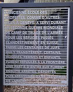 On Wednesday 27 January 2016, a memorial to the Jewish victims of the Holocaust was unveiled next to the Cropettes primary school in Geneva.[11] This memorial is the first of the kind in Switzerland according to the CICAD.[18] This initiative was made in conjunction with the publication of a book by Swiss journalist Claude Torracinta recalling Rosette Wolczak's history.