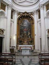 In the lower part of the church, the main altar is on the same longitudinal axis as the door and there are two altars on the cross axis. One altar is dedicated to Saint Michael de Sanctis, the other dedicated to Saint John Baptist of the Conception. Between these, and arranged in groups of four, sixteen columns carry a broad and continuous entablature. The arrangement seems to refer to a cross plan but all the altars are visible as the two central columns in each arrangement of four are placed on the oblique with respect to the axial ordering of the space. This creates an undulating movement effect which is enhanced by the variation in treatment of the bays between the columns with niches, mouldings, and doors. Architectural historians have described how the bay structure of this lower order can have different rhythmic readings[5] and the underlying geometric rationale for this complex ground plan, as well as discussing the symbolism of the church and the distinctive architectural drawings of Borromini.[6]