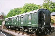 The hearse was a Southern Railway 53 ft 3 in (16.23 m) Gangwayed Bogie Luggage van, no. 2464, which was built in 1931 as part of a batch of 30. It had been withdrawn from normal service in 1961, and was set aside and repainted into the Pullman cream and umber colours in July 1962. The van was kept out of public gaze in Stewarts Lane carriage sheds.[8][9]