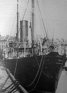 - On Tuesday 12 November 1901, shortly after departing Douglas en route to Liverpool, the Fenella went to the assistance of a small boat which turned out to be the Primrose of Whitehaven, Cumberland, and which was in difficulty, having lost her mast.[27] There was a gale blowing,[27] which meant that the Fenella could not lower one of her own boats in order to render assistance,[27] and therefore the three men aboard the Primrose (the skipper, his son and a deck hand),[27] had to be literally picked off the drifting vessel. The Fenella's Master, Capt. Thomas Roberts, is recorded as having exhibited fine seamanship in his handling of the Fenella,[27] and following the rescue the three crew members of the Primrose were taken to Liverpool.[27]