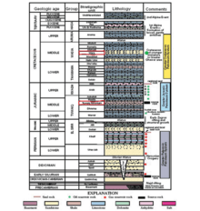 Jurassic source rocks began oil movement during the Late Cretaceous. The Tuwaiq Mountain source rock reached early stage maturity for oil generation at about 100 Ma and continued to attain its peak oil expulsion in the deeply buried areas at Early Tertiary time, approximately during a period of 65-54 Ma. Hydrocarbons generated then began to accumulate in fold structures around the region. At the eastern side of the basin oil generation and expulsion began about 75 Ma. By 50 Ma the oil had expanded westward and started filling structures that had formed during the late Cretaceous.Today the Hanifa and Tuwaiq Mountain source rocks in the east have passed through the oil generation window but may also still be within the oil generation window. In the western part of the basin the source rocks are still immature and soon will enter the oil window.[10][11]