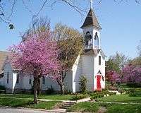 St. Paul's Episcopal Church is an historic Carpenter Gothic style Episcopal church building located on a triangular lot at 416 Southeast Grand Avenue at the corner of Fifth and Green streets in Lee's Summit, Missouri, United States. The parish was established in 1867. The original sanctuary and current building were designed by the Rev. Frederick B. Scheetz and completed in 1884. The building is a rare example of an extant wood framed Carpenter Gothic church in the state of Missouri. The interior walls and vaulted ceilings are covered with narrow strips of wood paneling set diagonally on the walls and horizontally on the ceiling. A trio of stained glass windows is set above the wooden altar in the apse at the north end of the transept. The church has received few if any alterations since it was built in 1884.[2]