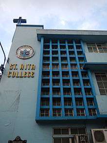 Saint Rita College is a Private Roman Catholic Agustinian-Recollect college run by the Order of Agustinian-Recollect nuns in the Philippines. It is situated in Plaza del Carmen, Quiapo, Manila, where the Motherhouse of the Beaterio de Terciarias Agustinas Recoletas, now Congregation of the Augustinian Recollect Sisters is located. It was founded in 1907 as "Escuela de Santa Rita", the first school of the Agustinian-Recollect Sisters which offered free education to Kindergarten girls, and special courses such as Spanish, Music, Painting and Embroidery.[1]