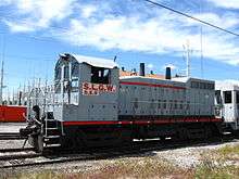 A total of eleven diesel locomotives have been owned and operated by the SLG&W, starting with D.S. 1 purchased in December 1951. In addition, motor car MC-3, built by American Car & Foundry and purchased by the SLG&W in 1951, was used to supplement the diesel-powered passenger trains. This car was later sold to the California Western and is still in operation as M-300.[3]Currently the line operates only two locomotives, D.S. 9 and 10, both ex-Union Pacific SW10 diesel-electric locomotives.