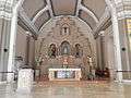The church measures 60 meters high, 13 meters wide and 13 meters high.[2] The facade and bell tower is dominated by series of vertical lines and recesses. Devoid of other detailed ornamentation, only the column capitals, finial caps, cornices and a saint’s niche located at the center of the protruding pediment break the simplicity of the façade’s layout. A concrete porte-cochere mars the view of the entire front. To the left of the church rises the three-storey bell tower topped by a silver cross. To the opposite direction is the arcaded convent with predominant semicircular arches on the first level and geometric patterns of the second level. It is reminiscent of the Art Deco style. The massive dome attributed to Father Ibeas no longer exists.