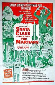 Some less-than-serious films feature Santa Claus as a superhero-type figure, such as the 1959 film titled Santa Claus produced in Mexico with José Elías Moreno as Santa Claus. In this movie, Santa allies with Merlin the magician to battle the Devil, who is attempting to trap Santa.[5] In the Cold War-era film Santa Claus Conquers the Martians (1964), Santa Claus is captured by Martians and brought to Mars, and ultimately foils a plot to destroy him.[6] The Night They Saved Christmas (1984), starring Art Carney as Santa, likewise chronicles how Santa Claus and Claudia Baldwin (Jaclyn Smith), the wife of an oil explorer, have to save the North Pole from explosions while Baldwin's husband is searching for oil in the Arctic. Santa Claus: The Movie also contains a subplot in which Santa Claus rescues Joe (Christian Fitzpatric) from his best friend Cornelia's (Carrie Kei Heim) evil step-uncle B. Z. (John Lithgow).[7] Santa is a hero in The Nightmare Before Christmas, held captive by Oogie Boogie, although he is spiteful and enraged at Jack when freed. The latest films to depict Santa Claus in such a manner are The Chronicles of Narnia: The Lion, the Witch and the Wardrobe (2005), and the Dreamworks film Rise of the Guardians. In the Chronicles of Narnia film, Father Christmas (James Cosmo) supplies the Pevensie children with the weapons and tools they need to battle the White Witch (Tilda Swinton). In Rise of the Guardians, where he referred often to as North (Alec Baldwin), is shown as one of the main characters and leader of the guardians, who are the heroes of movie. In the show South Park, Santa is often depicted with firearms; in the episode "Red Sleigh Down", he battles Iraqis to try to bring Christmas to Iraq. In the episode "A Woodland Critter Christmas", he uses a combat shotgun to blast away satanic animals who try to give birth to the AntiChrist. Santa (played by Nick Frost) made a brief appearance at the end of the Doctor Who episode, "Death in Heaven". In the following episode, which served as the show's 2014 Christmas special, "Last Christmas", he plays a more prominent role. It is eventually revealed that the scenes with him are the characters experiencing a shared dream, and he is their subconscious trying to help them wake up before they are killed. At the episode's end, he successfully awakens the Doctor and Clara, reuniting the two.
