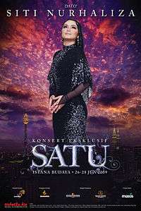 SATU Konsert Eksklusif Dato' Siti Nurhaliza (referred to it as SATU; Malay: The One) is the sixth concert and the eighth solo concert by Malaysian pop singer Siti Nurhaliza to support her thirteenth studio album, Lentera Timur and in conjunction with the Father’s Day on 21 June.[1][2] This concert is her first colossal theatrical concert.