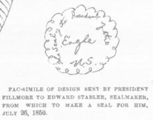 The documented history begins in 1850, when a seal was made after a crude drawing submitted by President Fillmore. It depicted an eagle "displayed with wings inverted", i.e. with its wingtips down, holding an olive branch and three arrows in its talons. The shield is essentially the same as the Great Seal, with a blue chief and red and white stripes and the eagle facing to its right, though there were nineteen stripes and the outermost stripes were red, both unlike the Great Seal. Thirty-one stars were distributed above and around the eagle, indicating that the seal dates from after when California became the 31st state in September 1850. It was made by Edward Stabler, a farmer and postmaster in Sandy Spring, Maryland, who had earlier made seals for the Senate, House of Representatives, and several government departments.[14] Stabler had also made a seal for the Vice President in 1846, and the correspondence surrounding it indicated that even earlier vice presidential seals existed, so presumably earlier presidential seals existed as well.[15] The president's seal was described by Benson Lossing in 1856 as "round, with an eagle upon it" (contrasting it to the seal used during the Continental Congress).[10]