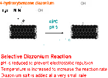 Primary condition is addition of reactant molecules at a very small rate to SWNT solution for a sufficient long time. This ensures reaction with only metallic SWNTs and with no semiconducting SWNTs as all the reactant molecules are taken up by the metallic SWNTs. Long time injection ensures that all metallic tubes are reacted. For example, one highly selective condition is: addition of 500 µL of 4-hydroxybenzene diazonium tetrafluoroborate solution in water (0.245 mM) at an injection rate of 20.83 µL/h into 5 mL of SWNT solution (1 wt % sodium dodecyl sulfate (SDS)) over 24 hrs. However, if the entire diazonium solution is added all instantaneously then semiconducting SWNTs will also react due to presence of excess reactant.[4]