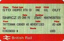 There have been few significant changes since then, with frequent changes in the design of the Railcard being the most noticeable. On all types of ticket for which a discount is available, the level is 34%, as it has been since the changes of 1992; and the types of tickets which receive discounts remains largely the same.[9] The discount is also available on most new ticket types introduced since then, such as SuperAdvance and Virgin Value. Similarly, there has been little change in the types of ticket excluded from receiving discounts; these are summarised here. The restriction on journeys made in the morning peak in the former Network SouthEast area (now known as the "London and South East area") also remains.[10]