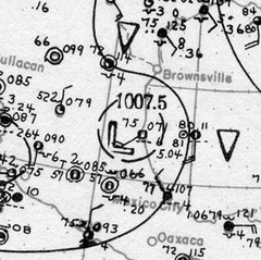 Shortly after, the hurricane made landfall south of Tampico, Mexico near La Leja at 0300 UTC on September 27.[6][7][1] At the time, the cyclone had maximum sustained winds of 80 mph (130 km/h), making it a Category 1 on the modern-day Saffir–Simpson hurricane wind scale. The storm's minimum barometric pressure at landfall was 985 mbar (hPa; 29.10 inHg); this would be the lowest pressure estimated in association with the storm, though it was not included in HURDAT. Just prior to landfall at 0100 UTC, a ship had reported winds of 80 mph (130 km/h) from the southeast and a pressure of 996 mbar (hPa; 29.42 inHg). Upon landfall, a barometer in Tampico reported a minimum pressure of 1003 mbar (hPa; 29.62 inHg).[1] The Signal Corps map of the cyclone for September 7 indicated a pressure of at least 1007.5 mbar (hPa; 29.75 inHg) for the storm's outermost closed isobar, with a storm of similar nature positioned a short distance west of Jalisco, Mexico in the eastern Pacific Ocean.[8] Once inland, the hurricane weakened, and made a northward curve before degenerating into a remnant low after 0600 UTC on September 8.[2] The remnant low progressed northward, and moved into Texas from the state border with Mexico near Webb County. In Texas, moisture associated with the system and other contributing forces produced excessive rainfall over Central Texas, causing numerous rivers to overflow.[7]