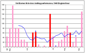 Barnes ended the first-class tour with 1,354 runs at 56.41 including three centuries, placing him fifth in the aggregates and sixth in the averages among the tourists. Barnes's form peaked in the Tests, scoring 329 runs at 82.25; among the Australians he ranked third in the aggregates and second in the averages.[3][127]