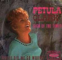 "Sign of the Times", also known as "A Sign of the Times", is a song performed by Petula Clark and released from her album My Love in March of 1966. It was the follow-up to her #1 US hit "My Love," which had been the title selection from the aforementioned album, and it continued her association with writer/producer Tony Hatch and songwriter Jackie Trent. However, "A Sign of the Times" had a more percussive sound than had been evident on Clark's previous singles, or than would become evident on her later ones.[1][2][3][4]
