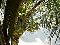 Different versions of the legend are told in different countries in Oceania.[4] The coconut tree (Cocos nucifera) has many uses and is an important source of food. It is also used for making coconut oil, baskets, sennit rope used in traditional Samoan house building, weaving and for the building of small traditional houses or fale. The dried meat of the coconut or copra has been an important export product and a source of income throughout the Pacific.