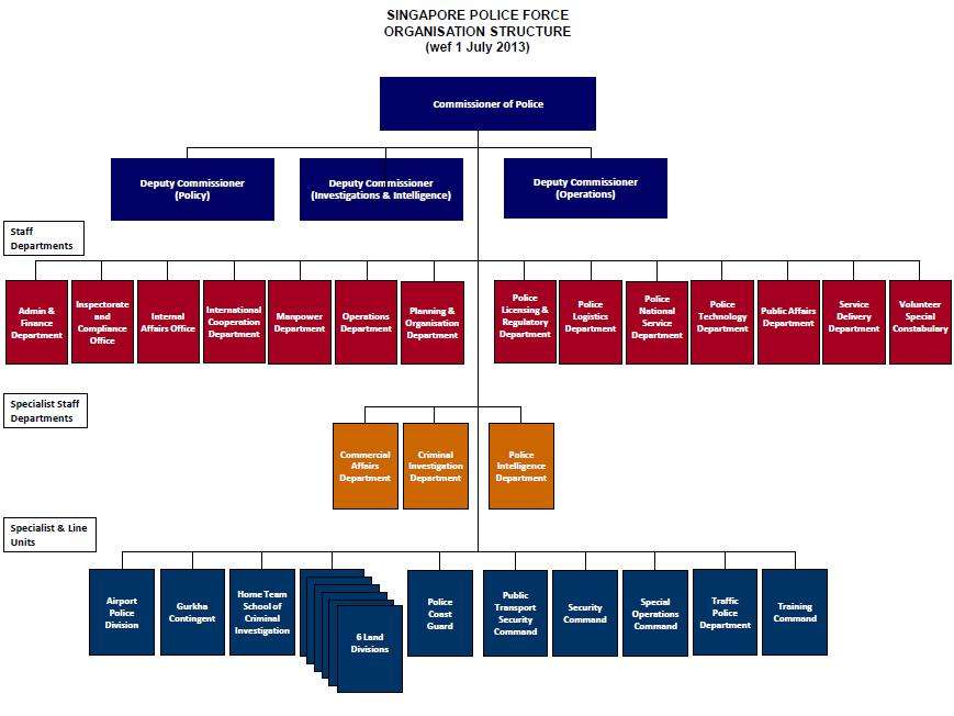 The organisational structure of the SPF is split between the staff and line functions, roughly modelled after the military. There are currently 14 staff departments, 3 specialist staff departments and 15 specialist and line units (including 6 Land Divisions). The headquarters is located in a block at New Phoenix Park in Novena, adjacent to a twin block occupied by the Ministry of Home Affairs.[6]