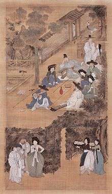 Women could only have four types of "professions" in Joseon: they could become gungnyeo (palace women), shamans, physicians or gisaeng.[26] The latter, who are often compared to Japanese geisha, could live a freer life than most women. They could read and write, were skilled in music, arts, poetry and served as intellectual companions to men in a period where wives were not allowed to be true companions because of the Confucian restrictions.[21] The most famous gisaeng is probably Hwang Jin-yi, who lived in the 16th century and is considered a role model of progressive, self-conscious women in Korea.[27]