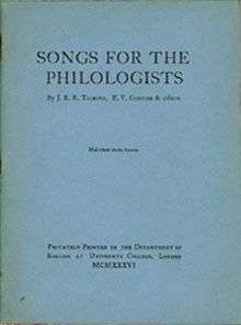 Songs for the Philologists is a collection of poems by E. V. Gordon and J. R. R. Tolkien as well as traditional songs. It is the rarest and most difficult to find Tolkien-related book. Originally a collection of typescripts compiled by Gordon in 1921–26 for the students of the University of Leeds, it was given by A. H. Smith of University College London, a former student at Leeds, to a group of students to be printed privately in 1935 or 1936, and printed in 1936 with the impressuum "Printed by G. Tillotson, A. H. Smith, B. Pattison and other members of the English Department, University College, London."