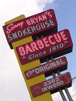 The Bryan family has operated memorable barbecue restaurants in the Dallas area for over a century. Sonny's grandfather, Elias Bryan, first opened his Bryan's Barbecue in 1910[2] while Sonny's father William Jennings "Red" Bryan opened Red Bryan's Smokehouse in 1930.[3] Sonny opened his Sonny Bryan's Smokehouse in 1958 and ran it until 1989 when he sold it to a group of Dallas investors.[4][5][6][7] Bryan died from cancer just a few months after the sale.[8][9]