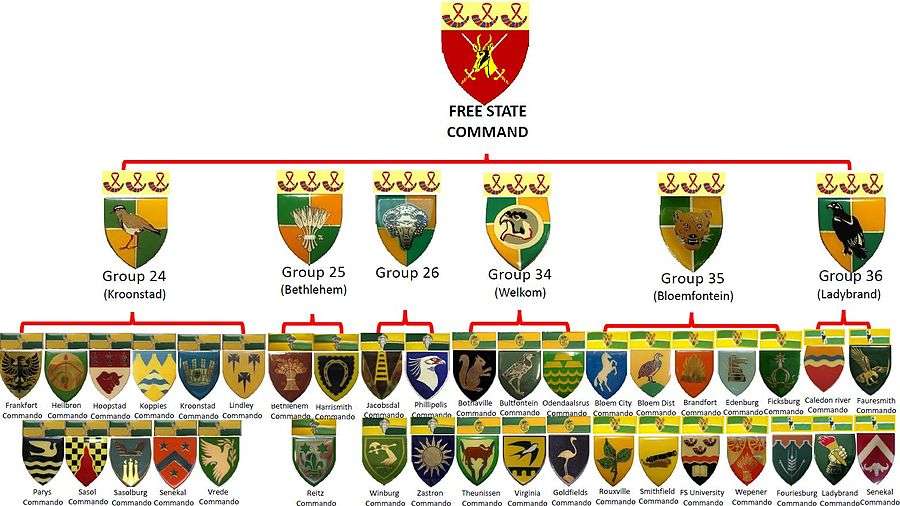 Under the SADF, Commando units were grouped regionally under Commands: (Please note: This was not a wholly static structure and units could move occaisionally between Groups, the diagrams below depict the structure from the late 1980's)