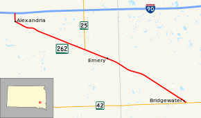 SD 262 begins at a diamond interchange with I-90 in rural Hanson County and heads south. The road almost immediately enters the city of Alexandria and takes the name of Spruce Street. In Alexandria, the route curves to the southeast and parallels a railroad. After this, SD 262 leaves the city and continues southeast. The highway crosses Pierre Creek just east of the city and passes through a series of curves which take the highway farther southeast. The road continues to parallel the railroad and intersects the southern terminus of SD 25 before traversing the community of Emery. East of Emery, SD 262 treks farther southeast through open plains and enters McCook County. The route travels for about six miles (9.7 km), then enters Bridgewater. Here, the highway reaches its eastern terminus at an intersection with SD 42.[2][3]